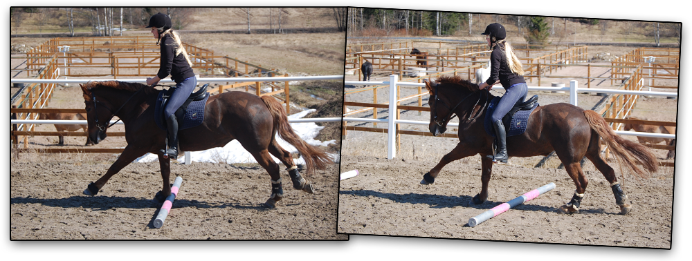 Siirryttiin välikäyntien jälkeen laukkaan ja tultiin myös laukassa puomisarjaa, joka sisälsi 7 puomia peräkkäin. Bohemia oikein syöksyi puomeille ja sai pidätellä että askeleet sopivat väleihin!